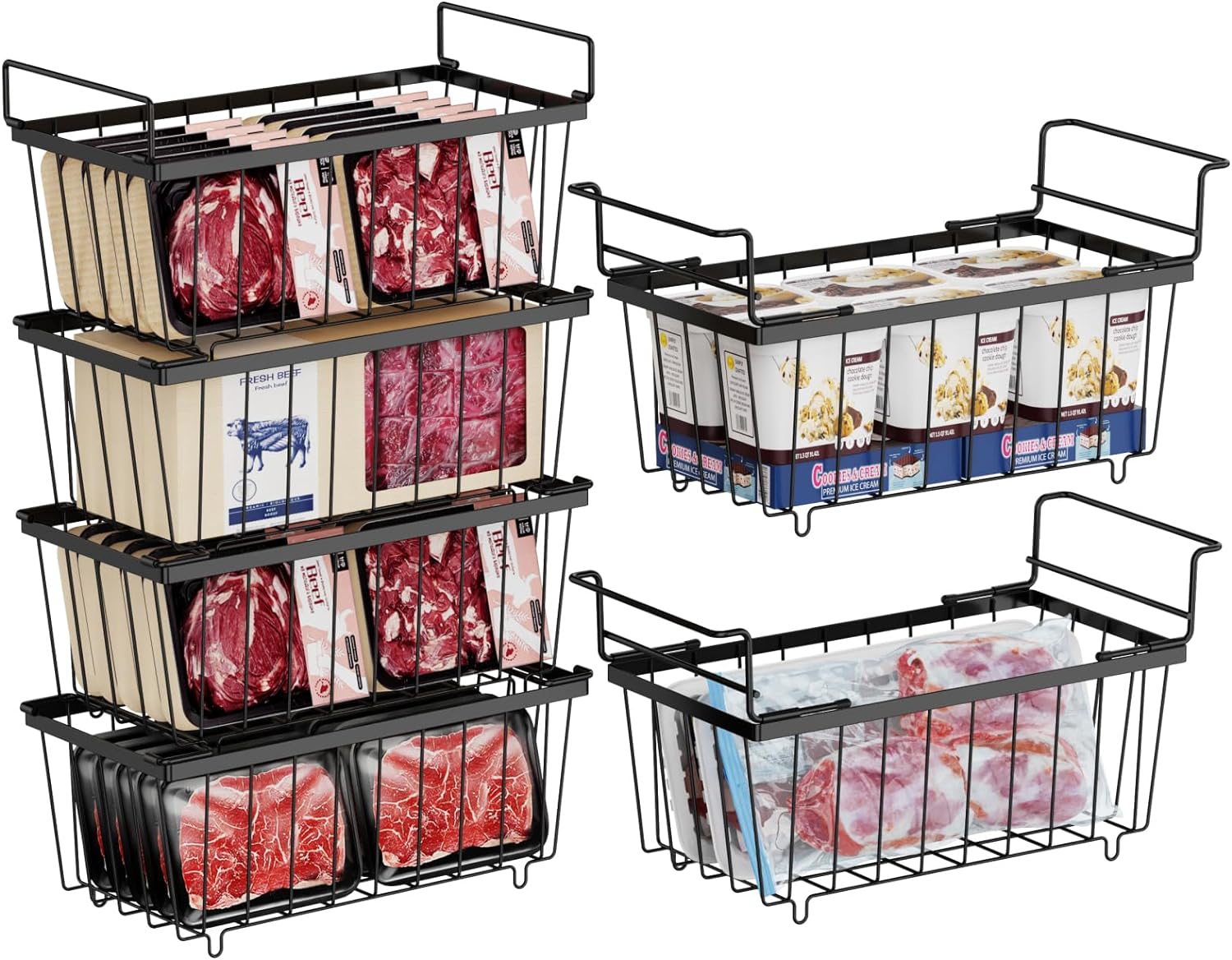 - [Sturdy for Long-lasting Use] With 20% thicker wires, our freezer container is more sturdy, and can hold up to 33lb heavy items without deformation; Unlike plastic baskets that can crack, these stackable freezer baskets can be used for a long time in a freezer, saving replacement costs and time